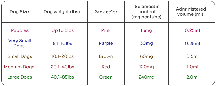 Every dog’s weight and size is different and considering this, Revolution is formulated in different packs to suit dogs with different weight sizes. Here is the breakup of the pack sizes of Revolution: