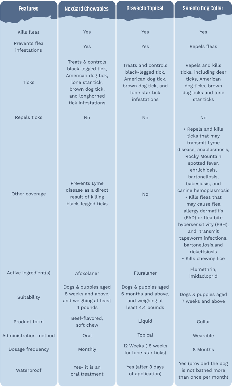 • Ingredients: NexGard contains afoxolaner, Bravecto Topical is made using fluralaner, and Seresto Dog Collar contains a combination of flumethrin and imidacloprid.